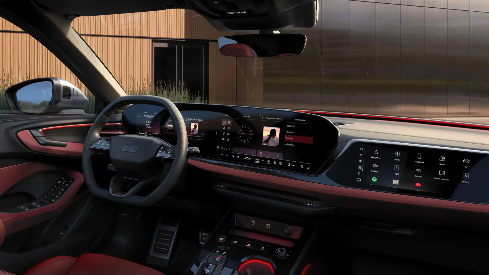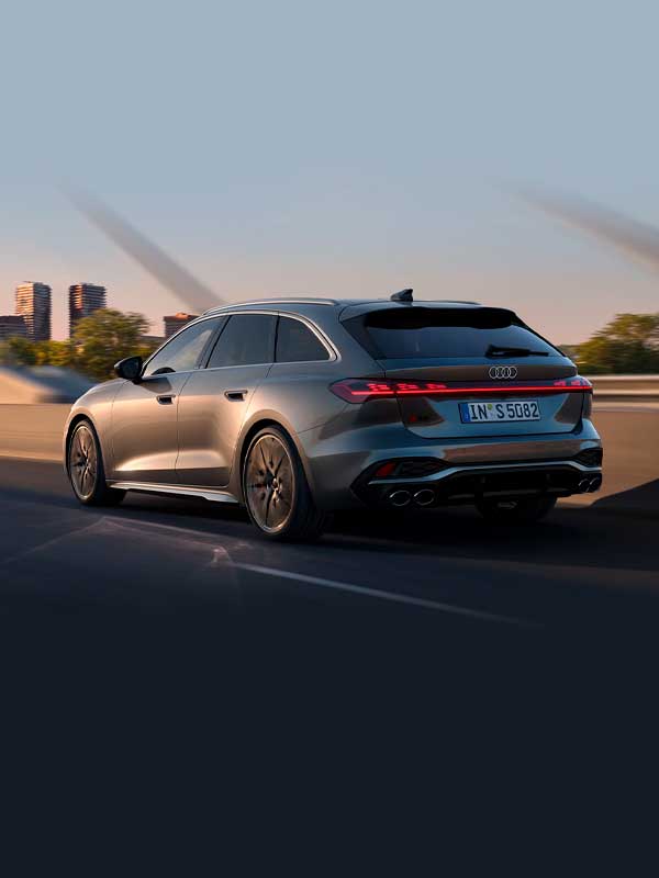 El frontal del vehículo, con una gran anchura y profundidad visual, ofrece una imagen especialmente deportiva que se realza con la parrilla Audi Singleframe, con estructura tridimensional de panal de abeja, faros afilados y entradas de aire de diseño aerodinámico.